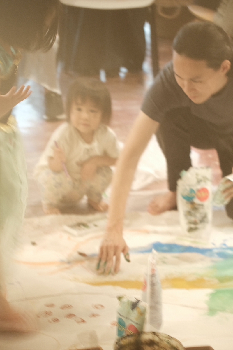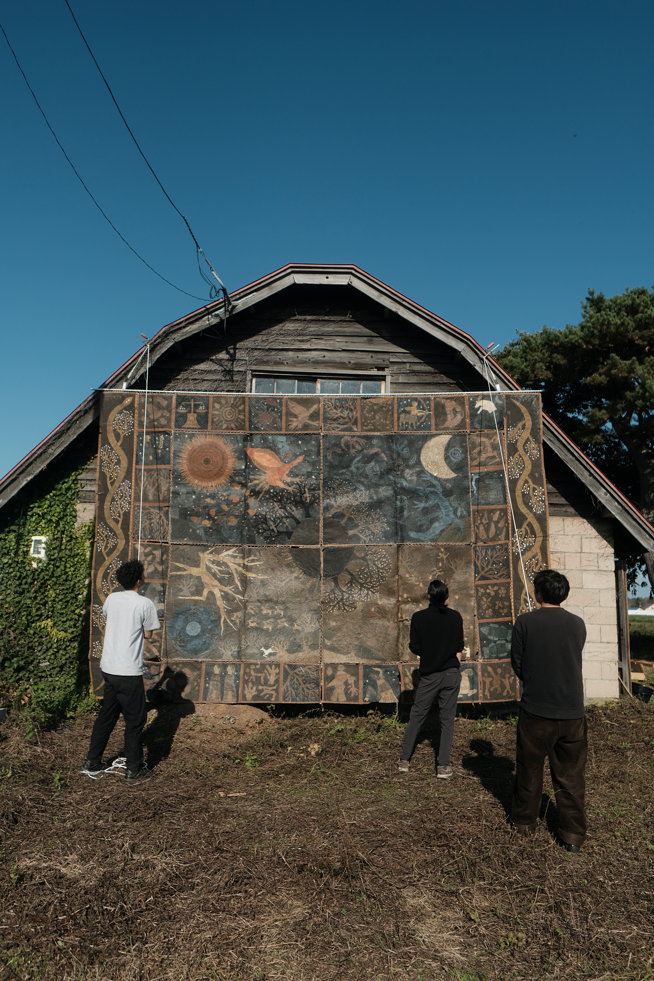 旅の道中では巨きな絵と共に、新しい絵たちも展示しています。また一枚の紙にみんなで絵を描く"OUR songs"や、音楽と共に即興で絵を描くライブドローイング、お食事会などを行い、その時々で小さな祝祭のような場が生まれています。
