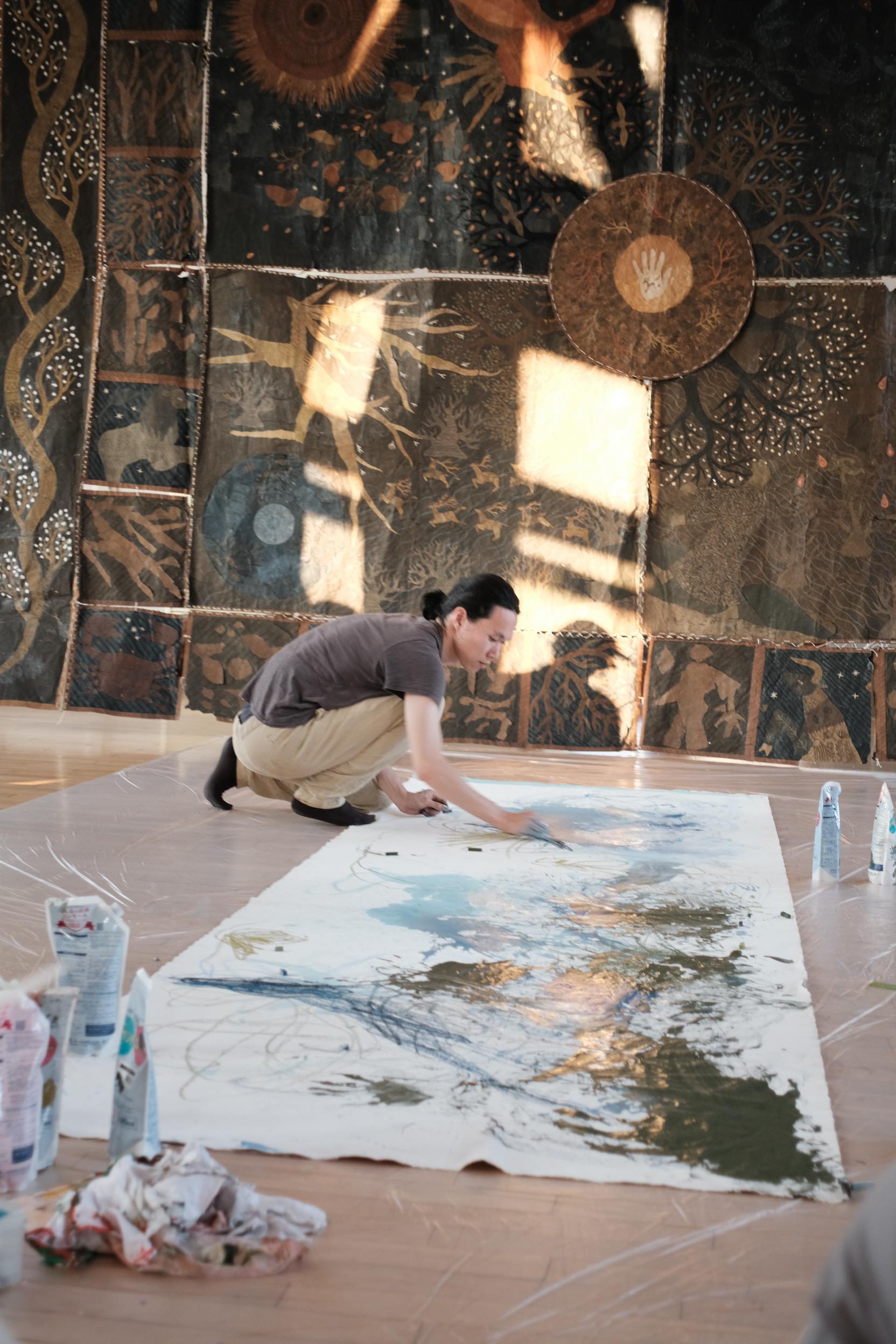 「存在の祭り」という原題のもと、それまでの絵描きの集大成として2018年に描かれたこの絵は、2019年2〜6月のあいだに静岡・大分・大阪で巡回展示され、ある時は屋内で、またある時は森の中で広げられました。