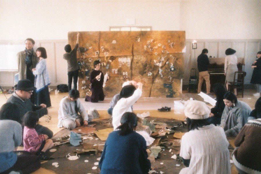 特別企画「この星で描く」(静岡・鴨江アートセンター 2019年3月)巨きな絵の最初の展示は2019年2月に行われ、静岡・鴨江アートセンターの最上階にある広い部屋にて、天井から吊るされて展示されました。また展示のクロージングイベントとして「この星で描く」という特別企画も行われ、会場全体を一つの祭りの場に見立てて、絵描きや詩人やピアニストを招き、参加者たちと共に一枚の絵を即興制作しました。