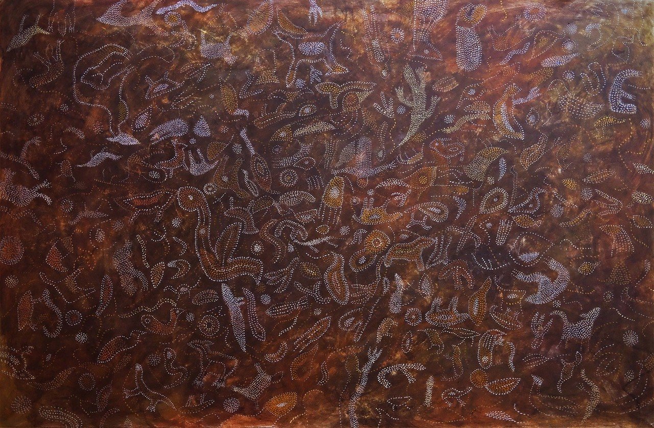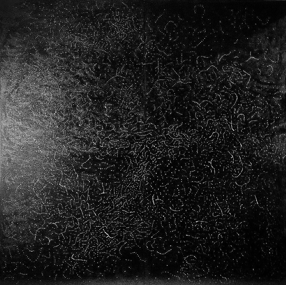 その年に浜松で親しくなった、絵描き仲間の中村菜月(なっちゃん)に助言を受けて、鹿の骨を粒子状に細かく砕き、それを膠と混ぜることで絵具にした。そして墨で真っ黒に染めたおよそ150cm四方の画面に、星が徐々に宙を充していくように白い点を散りばめていった。