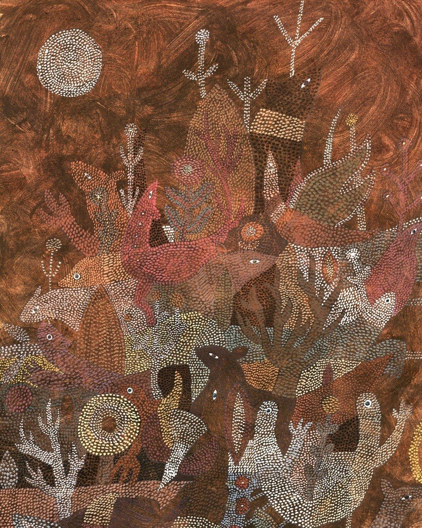 刺繍の点線による造形を絵の中に取り入れてみようと、まずはじめに生きもののかたちを点描する試みを行った。点が少しずつ増えていくと無数の見えない線たちが蠢いて見え、幾つものイメージがそこから今にも目覚め出すかのような気配が感じられて、ざわざわした。