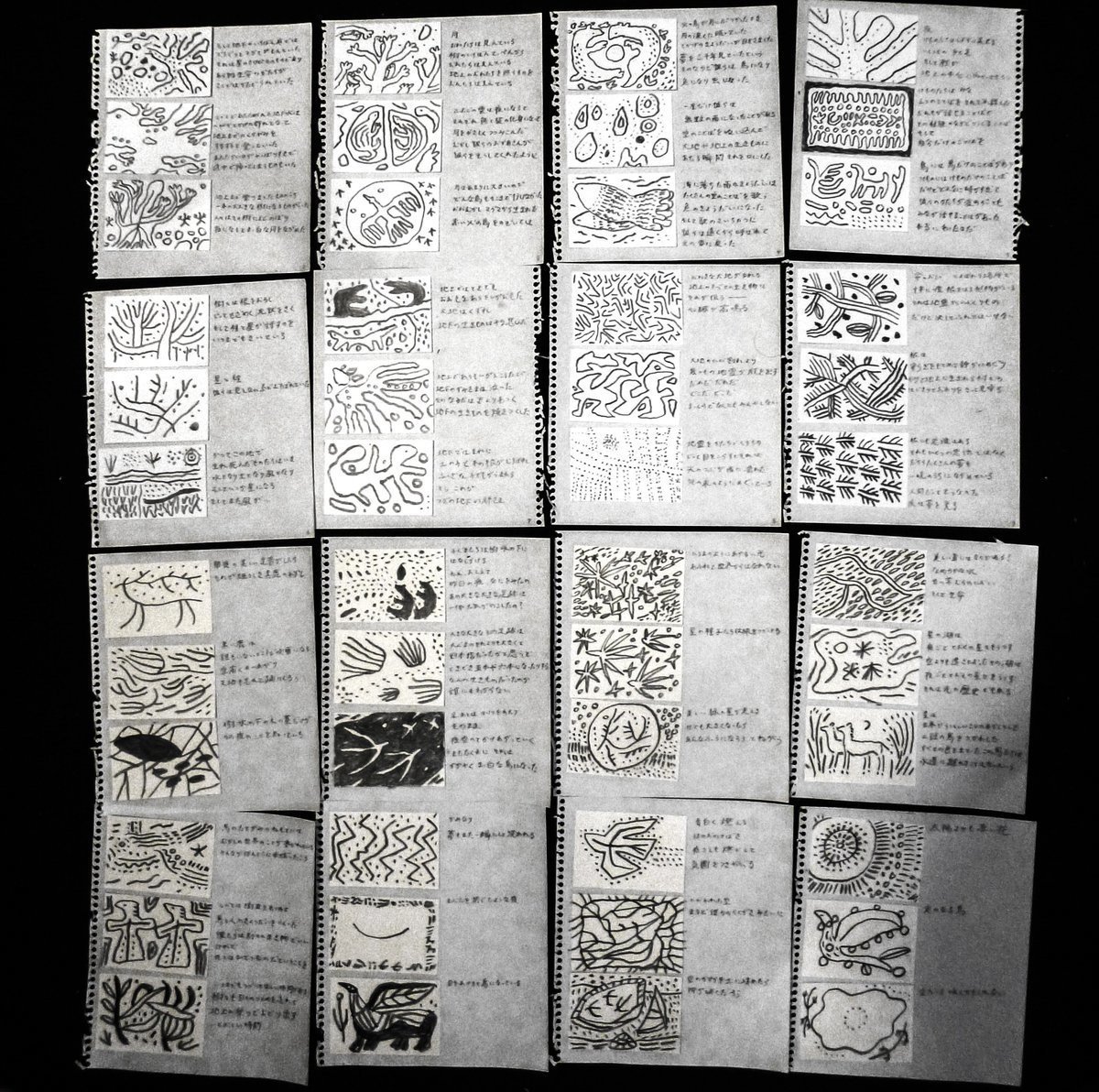 いくつかのモチーフ(抽象的な記号もふくむ)を小さな紙に線画で描き、そこに簡単なお話の断片を添えることで、徐々に物語めいたものが芽吹きだし、絵の種は成長していく。それは「虹の上をとぶ船」の版画制作のはじまりにおこなわれた、子どもたちによる小さなカード遊びにも少なからず影響を受けたものであった。