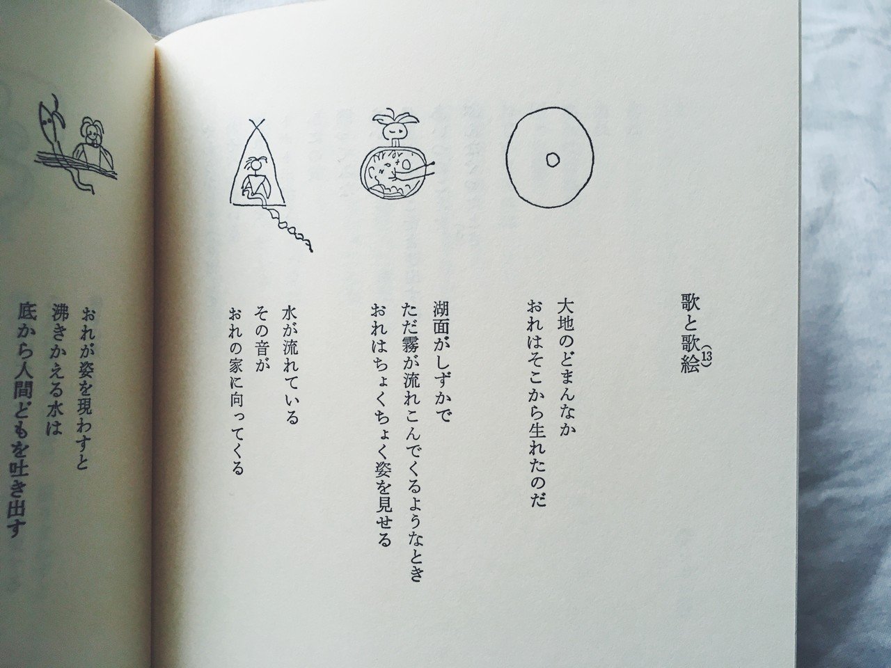 自分が本のなかで心惹かれた詩にもうひとつ、チッペワ族の「歌と歌絵」がある。これはおもに白樺の樹皮に描かれた絵が、それぞれ各部族の宗教的シンボリズムにもとづき、絵解きされて歌われたものだという。