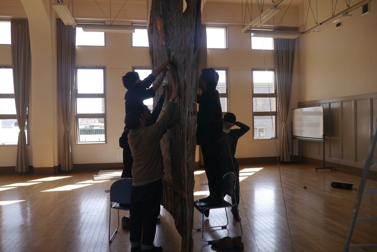 各場面に分かれた部分を、鴨江アートセンターの最上階の3階にある館内でもっとも大きな部屋にはこびこむと、館内のスタッフたちと一緒に、一枚一枚を麻紐で結び、部屋の中心に絵が来るように天井に吊るし上げた。