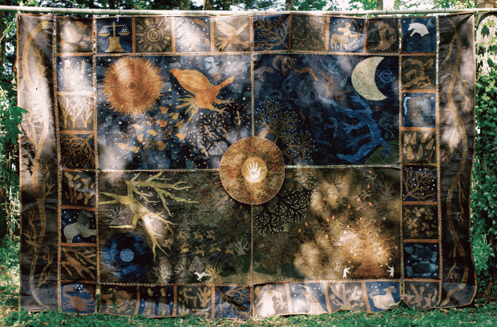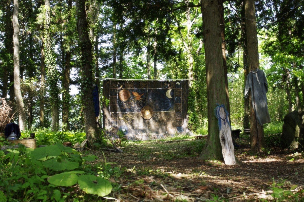 ライブステージとなる場所からやや離れた小高いところに、「古墳スペース」と呼ばれる木々に囲まれる開けた空間があった。祝祭の2日目には福岡のアトリエ兼ギャラリー・うつしきが、所縁ある作家たちと共に「森の民」をテーマにした展示を行うことになっていた。