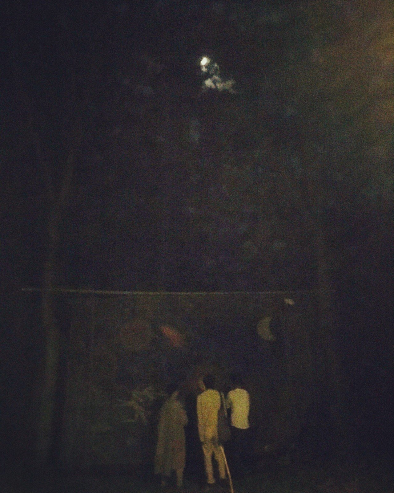 設営の途中からは、大阪からお手伝いとして同行してくれたふたりの友人が駆けつけて、三人で作業を進めた。それにもかかわらず設営は想像以上に長引き、すべての紐を結び終えた頃になると、辺りはすっかり暗くなってしまった。結局初日時点では絵の立ち上げを断念せざるを得なくなり、わずかな作業を残して、その日は絵のある空間を後にした。