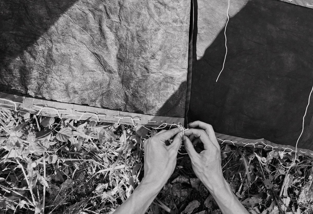 破かれた魚座の部分をはじめ、裂け目ができていた部分や剥がれた部分の補強等を済ませると、まだ未着手だった部分の加筆を仕上げていった。そしてカテリーナでの屋外展示を想定して、各部を結んでいた糸を麻紐から凧糸に変更し、友人の協力のもと、あらかじめ必要な場所を糸で結んでおく作業を発送予定の日までにどうにか間に合わせることができた。