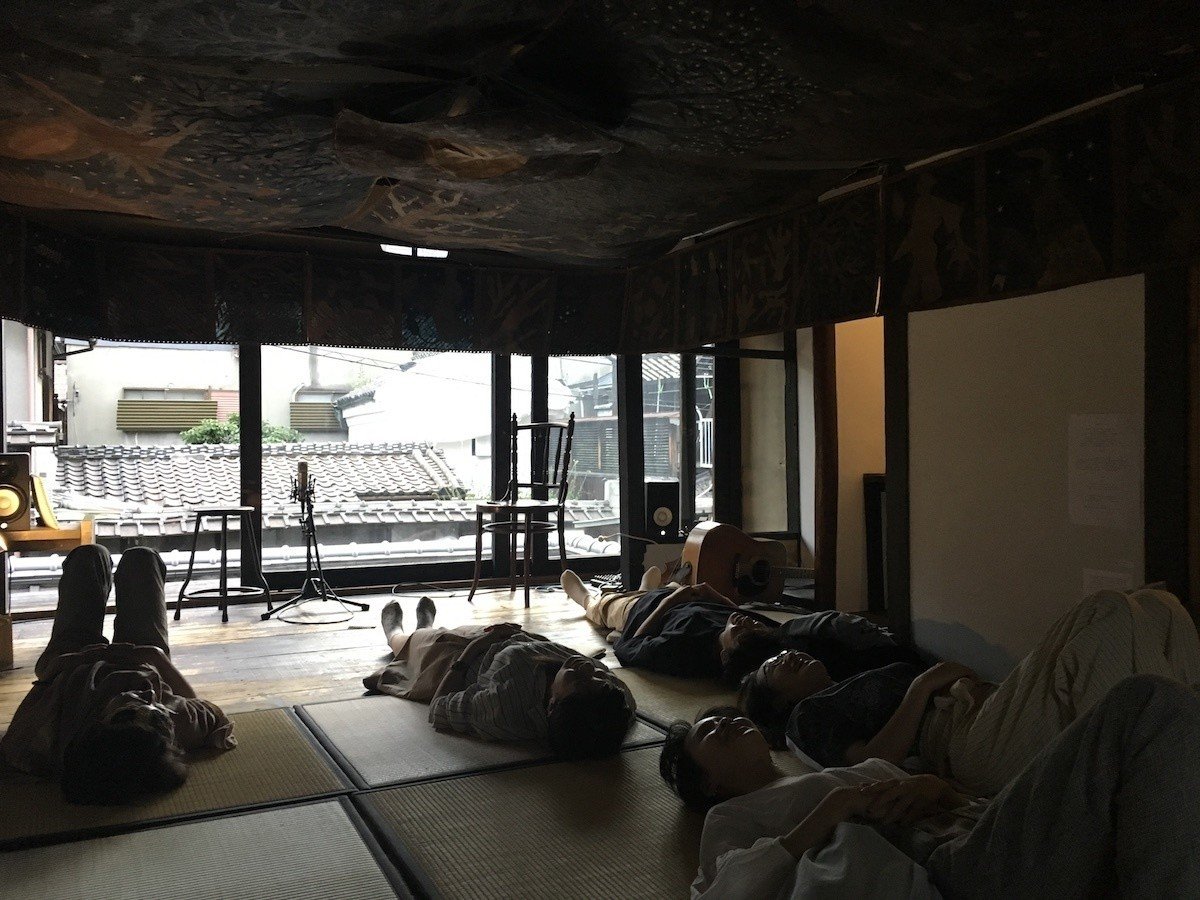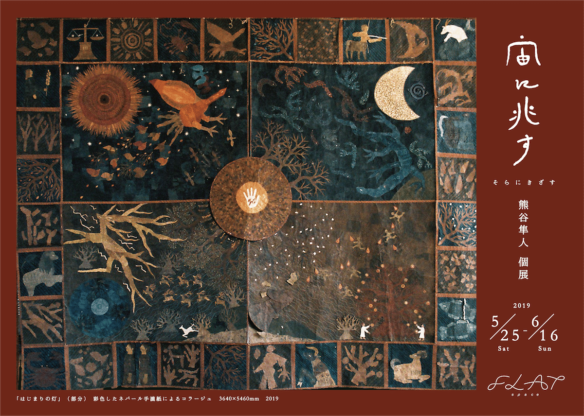 イルボンさんと巨きな絵巨きな絵はyolchaだとどうしても収まりきらないことから、隣にあるFLAT space(現chago。yolcha同様にイルボンさんが運営)で展示することがきまった。しかしFLAT spaceの最も広い畳の空間でもやはり面積が足りず、悩んだ末にイルボンさんの提案で、絵の一部を箱の上蓋のようなかたちで折り込んで天井に沿わせ、全体をタープ状に張って天井画にすることになった。