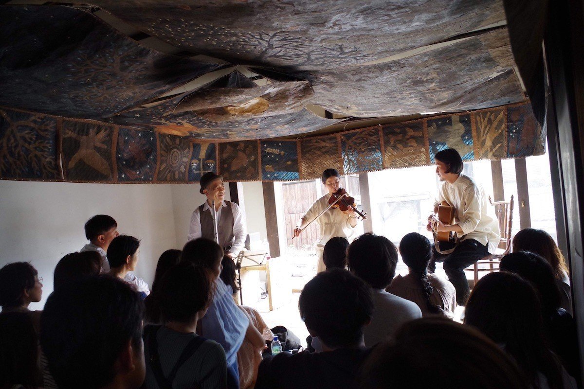 さらにイルボンさんのはからいによって、会期中にはなんとカテリーナの森の未來さん・舞香さんをお招きしての演奏会「宙に謳う」も開催することとなった。巨きな絵の下でおこなわれた演奏は、SING BIRD CONCERT FINALでも演奏されていた浜松出身の管楽器奏者・金子鉄心さんの飛び入り参加もあり、再びあの豊かな音楽の時間を思い出させるとともに、これから先待ち受けている旅の佳き在りようを自分に予見させてくれるかのような、忘れられない時間となったのだった。